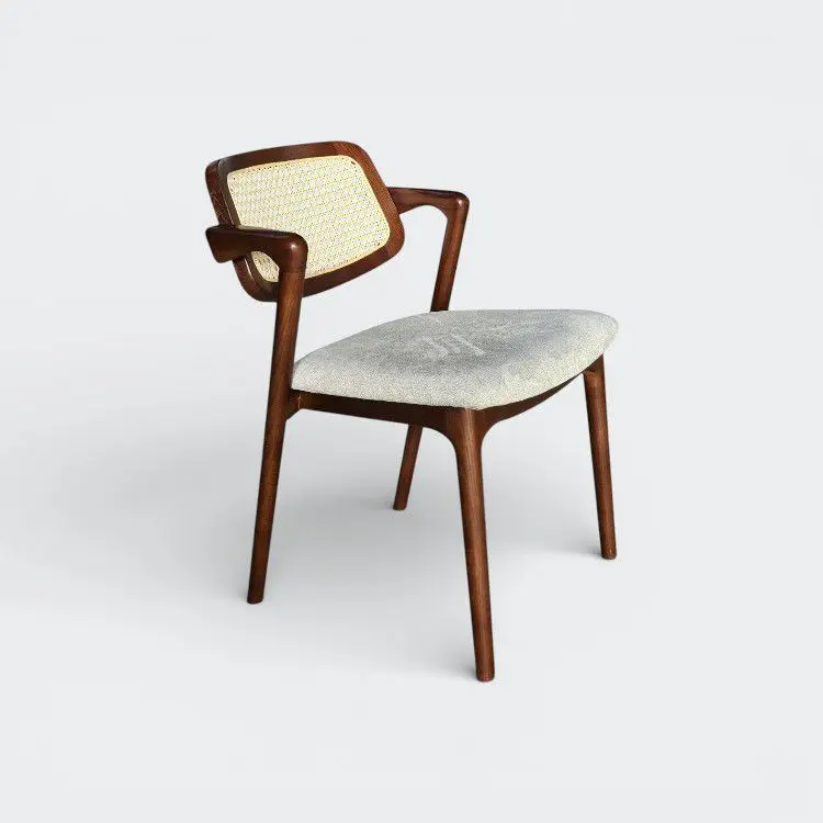 וגב ראטן בעיצוב פיסולי כמעט. המושב מרופד בבד שנותן קונטרסט יפה לעץ
