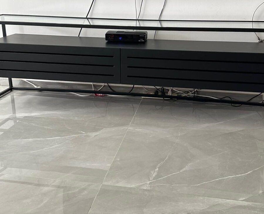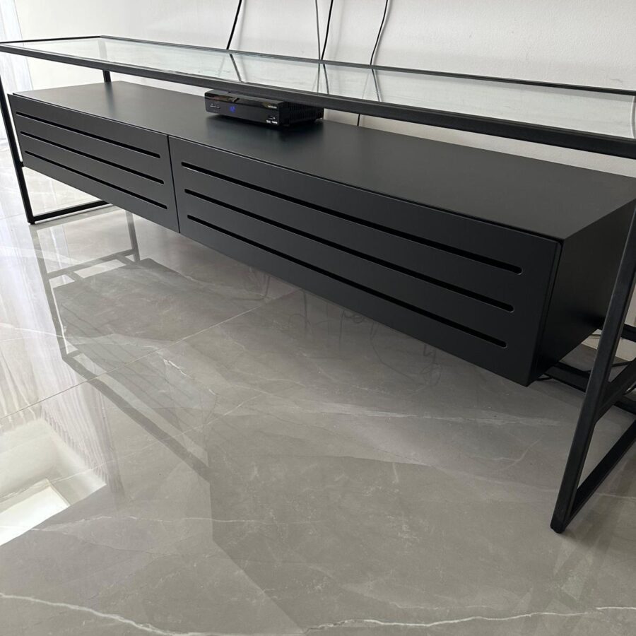 מזנון עשוי עץ איכותי בצביעה בתנור בשילוב זכוכית ורגלי מתכת אל חלד בצבע שחור
