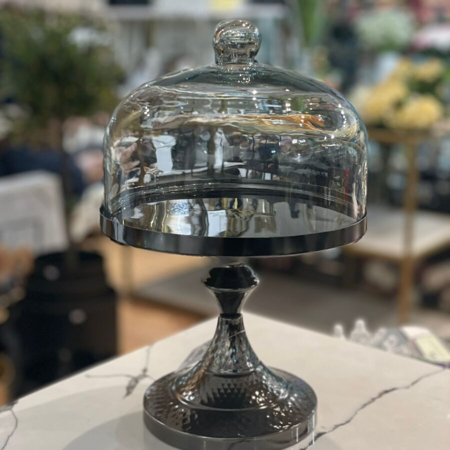 מעמד לעוגה מגש מראה ומכסה זכוכית על רגל שחורה