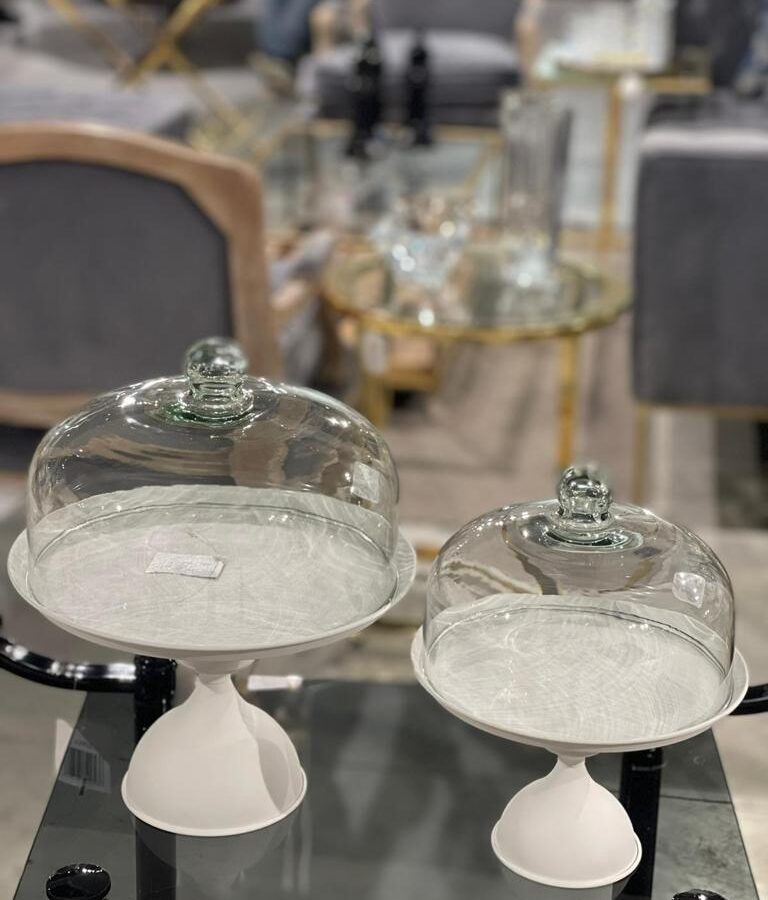 מעמד לעוגה על רגל עם מכסה זכוכית עשוי מתכת בצבע שחור