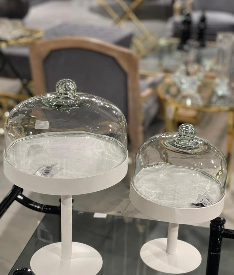 מעמד לעוגה על רגל עם מכסה זכוכית עשוי מתכת בצבע שחור