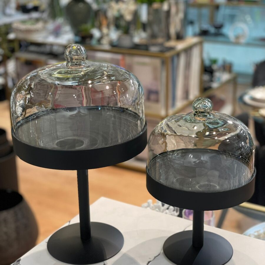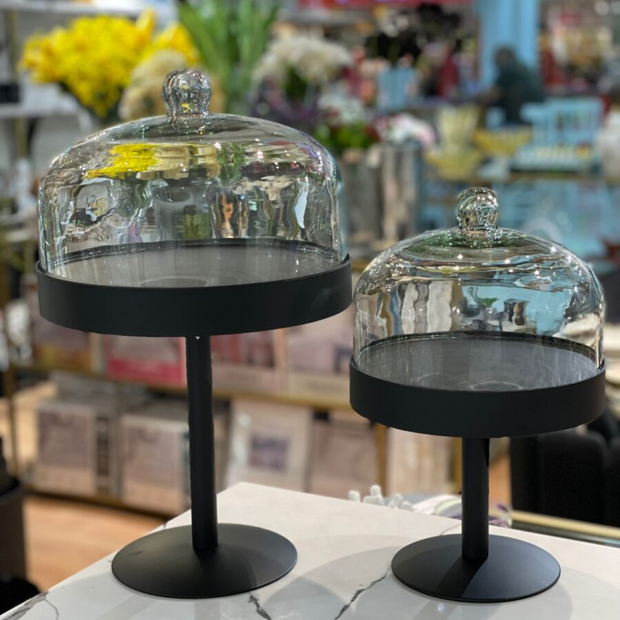 מעמד לעוגה על רגל עם מכסה זכוכית עשוי מתכת בצבע שחור