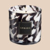 נר לבישום הבית מסדרת פרייבט קולקשן עשוי תערובת שעוות קוקוס טבעית עם ריכוז ריח גבוה במיוחד בכלי מנומר בשחור ולבן.