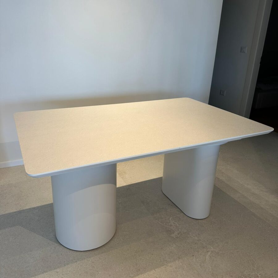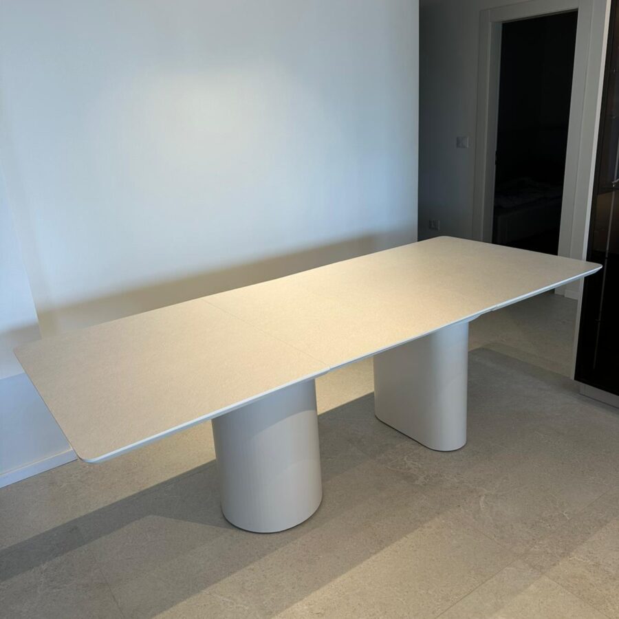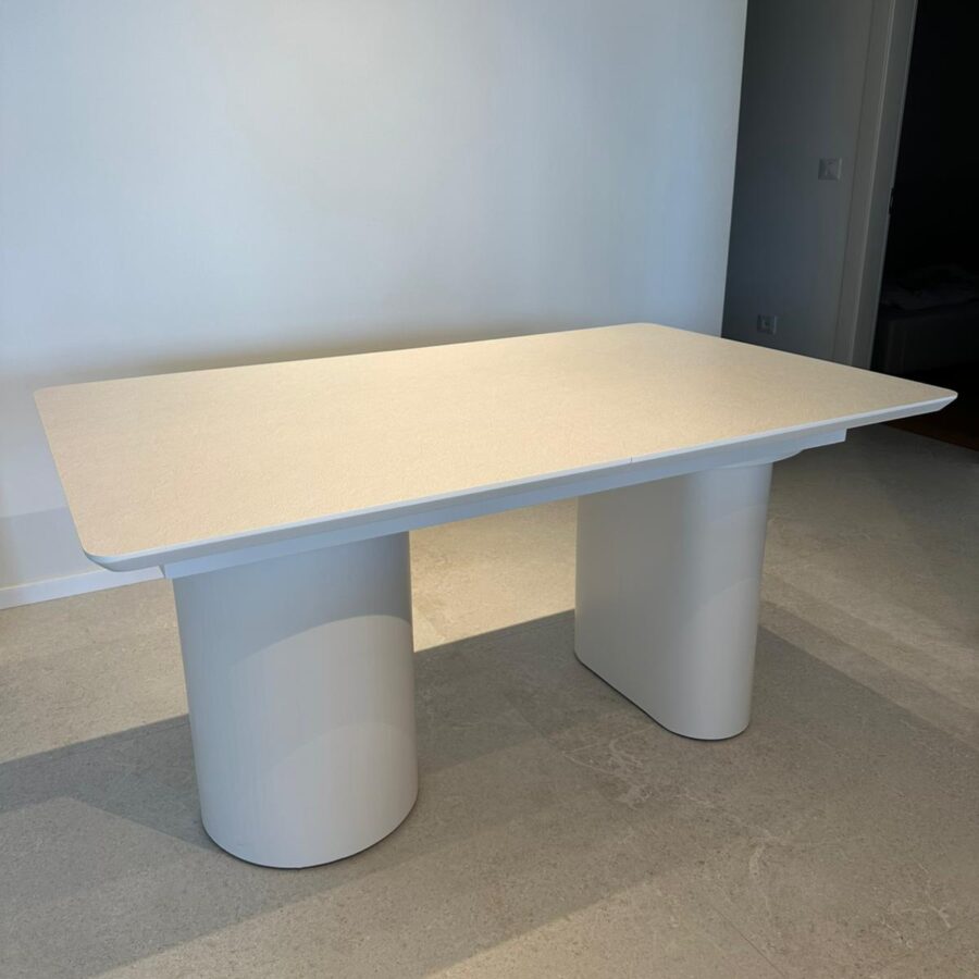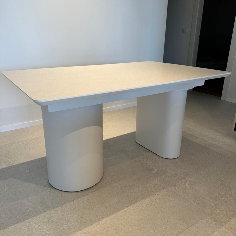 השולחן עשוי מרגלי עץ רגל אחת מעוגלת ורגל שנייה אובלית
