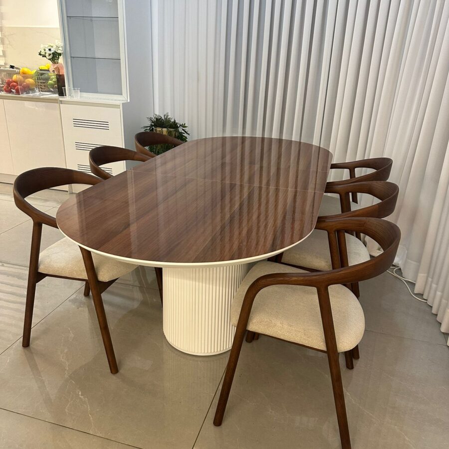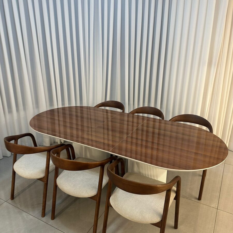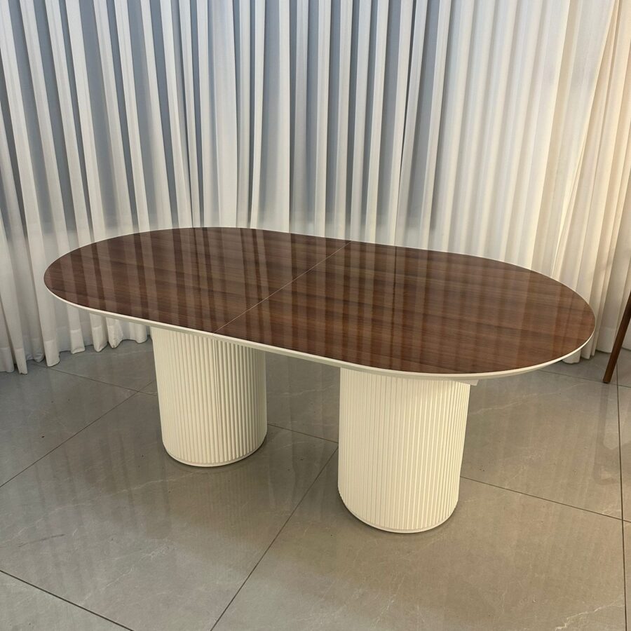 השולחן עשוי מרגלי עץ עם פסים מעוגלים