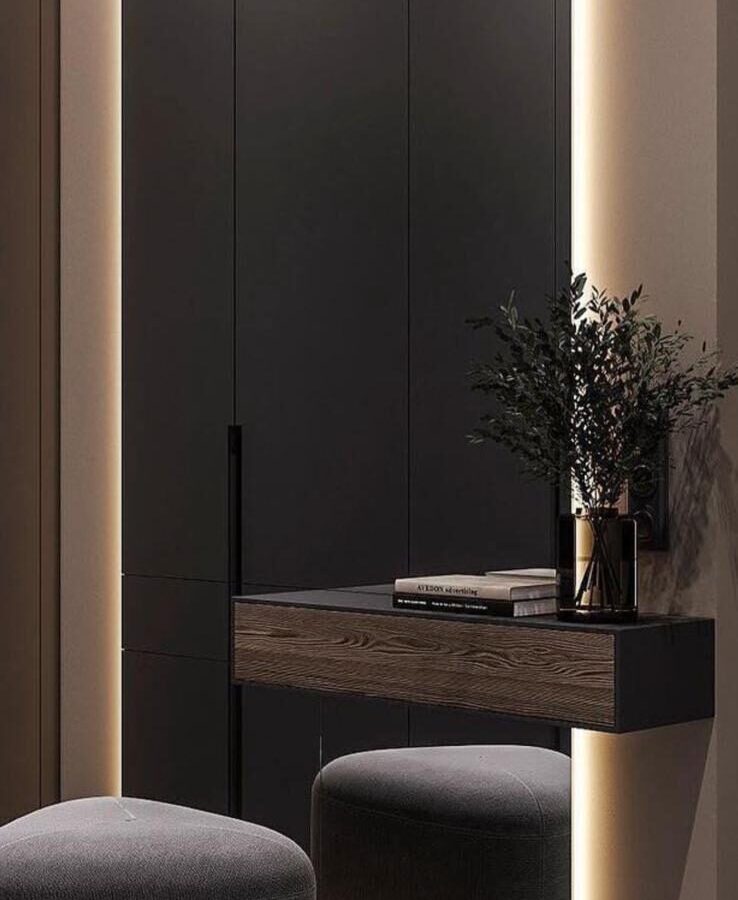 קונסולה מרחפת עשויה עץ איכותי בצבע גוף שחור ומגירה/קלפה בצבע אגוז