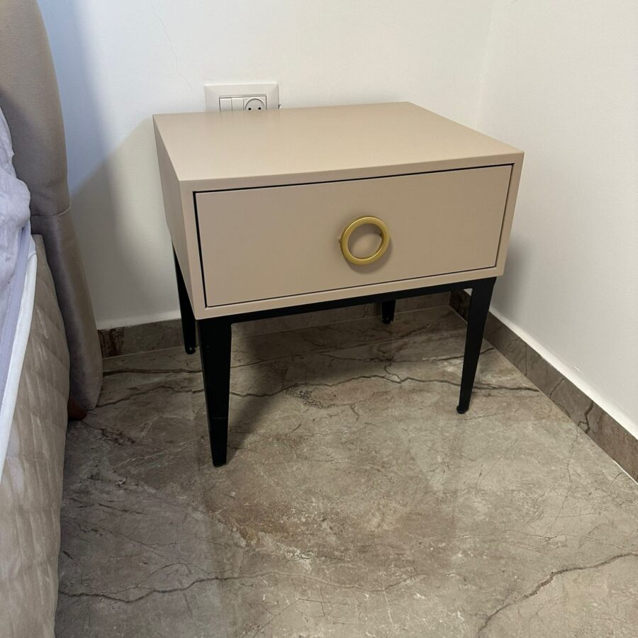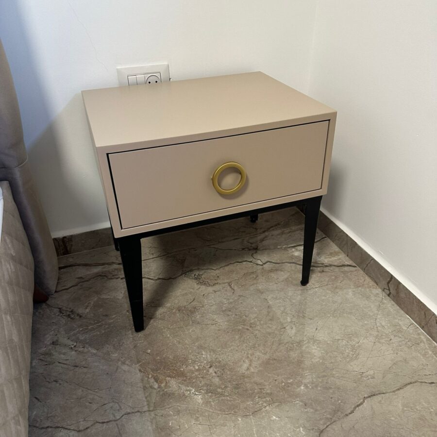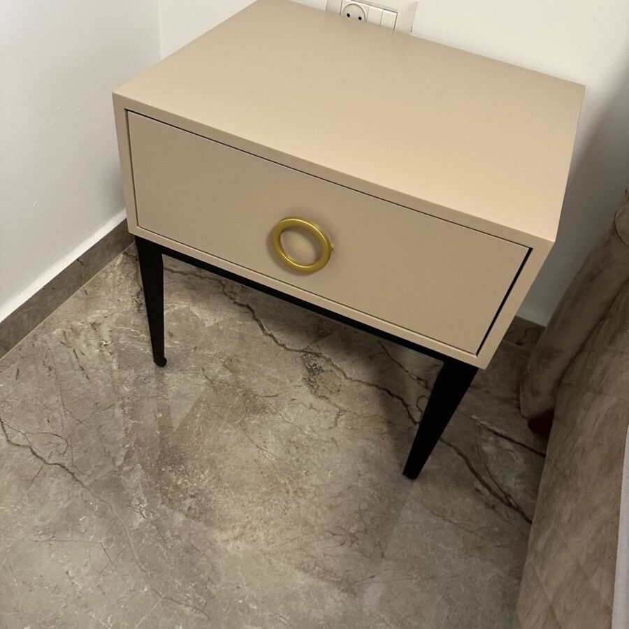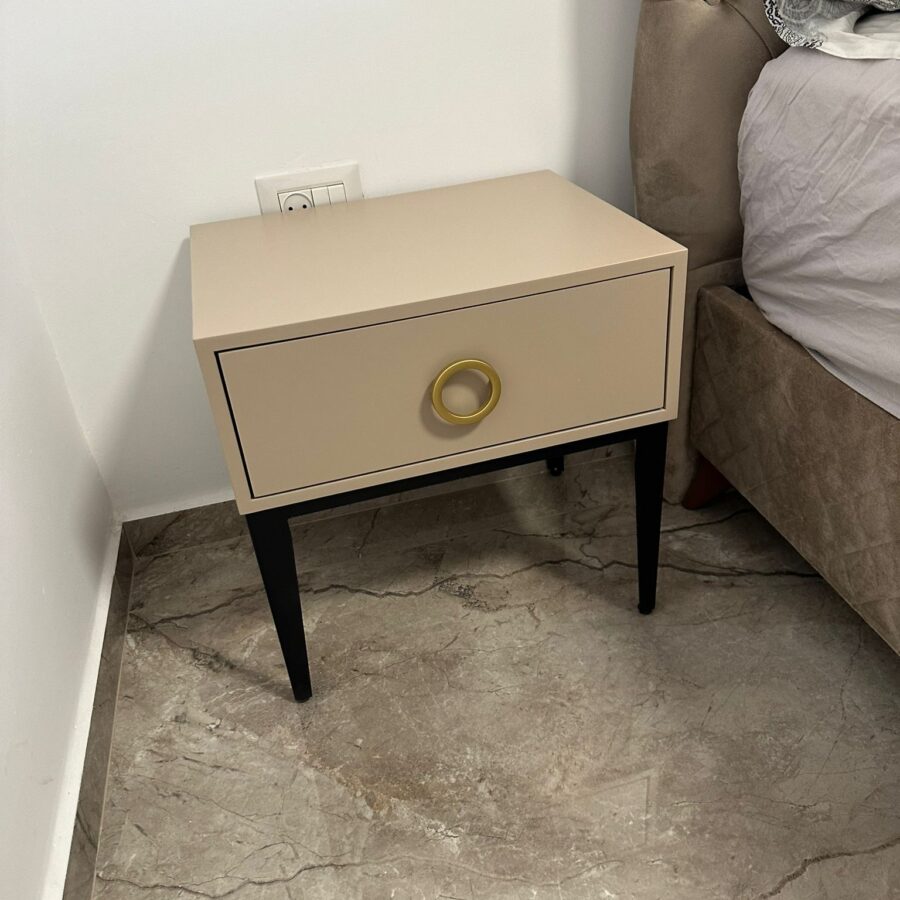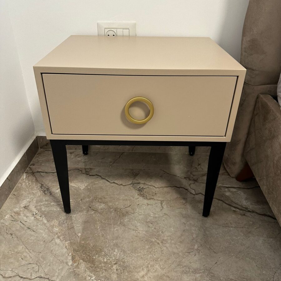 לשידה יש מגירה עם טריקה שקטה מאובזרת בידית בגוון זהב.
